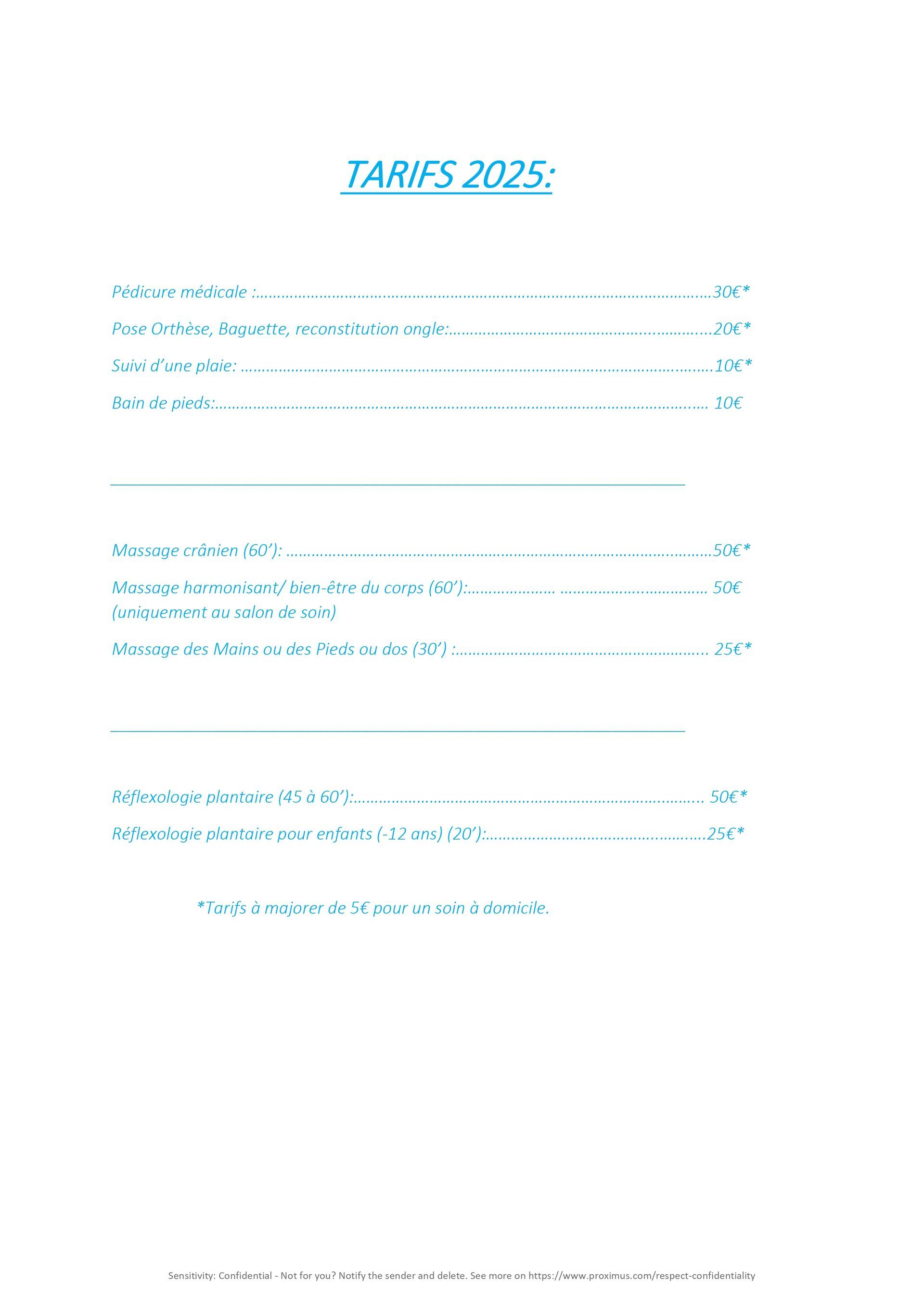 Avec mes diplômes d'esthéticienne, de Pédicure médicale depuis quelques années et en réflexologie plantaire plus récemment. Reconnue par le FeBeRef (Fédération Belge de Réflexologie). Ce métier est une passion et j'espère mettre mon expérience au service de votre bien-être.